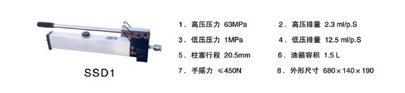 SSD1型手動(dòng)油泵由閥式配流高、低壓復合定量柱塞泵、單向閥、溢流閥、油箱等組成,是將手動(dòng)的機械能轉換為液體的壓力能的一種小型的液壓泵站。它具有超高壓、通用性強、體積小、重量輕、結構緊湊、操作方便等特點(diǎn),特別適用于野外無(wú)電源場(chǎng)所作業(yè)。