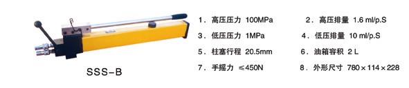 SSS-B型手動(dòng)油泵由閥式配流高、低壓復合定量柱塞泵、單向閥、溢流閥、換向閥、油箱等組成,是將手動(dòng)的機械能轉換為液體的壓力能的一種小型的液壓泵站。它具有超高壓、通用性強、體積小、重量輕、結構緊湊、操作方便等特點(diǎn),特別適用于野外無(wú)電源場(chǎng)所